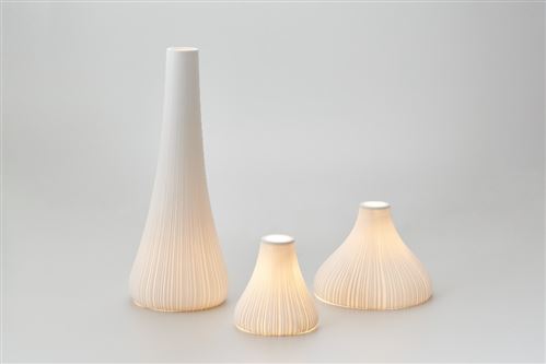 今まで有田焼の可能性を追求して参りました。その中で、照明メーカーとの交流で今回の作品が生まれました。あくまで有田焼の特徴である、天草陶石を主とした透光性のある原料(ホワイトブルー)を使用しこの特徴を出した作品です。