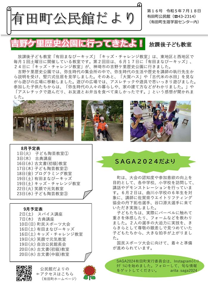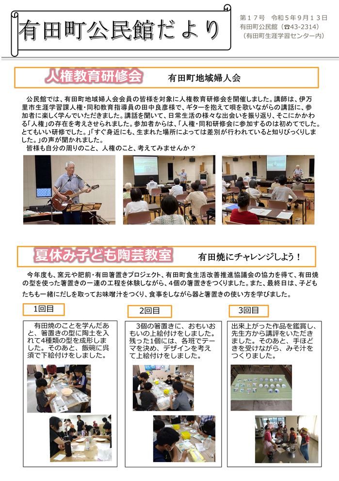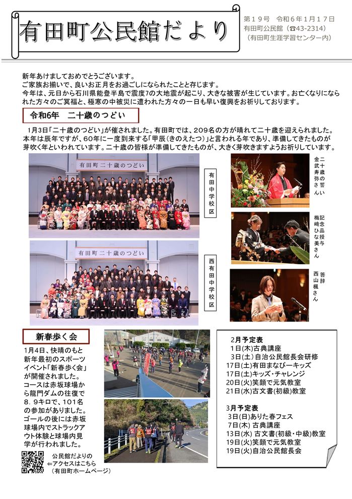 有田町公民館だより 最終更新日:2025年9月3日 印刷 令和7年度28号 公民館だより第28号(PDF:8.54メガバイト) 27号 公民館だより第27号(PDF:447.7キロバイト) 令和6年度26号 公民館だより第26号(PDF:1.02メガバイト) 25号 公民館だより第25号(PDF:1.07メガバイト) 24号 公民館だより第24号(PDF:372.3キロバイト) 第23号 公民館だより第23号(PDF:934キロバイト) 第22号 公民館だより第22号(PDF:1014.3キロバイト) 第21号 公民館だより第21号(PDF:922.5キロバイト) 令和5年度第20号 公民館だより第20号(PDF:699.6キロバイト) 第19号 公民館だより第19号(PDF:756.1キロバイト) 第18号 公民館だより第18号(PDF:877.5キロバイト) 第17号 公民館だより第17号(PDF:1.24メガバイト) 第16号 公民館だより第16号(PDF:1.27メガバイト) 第15号 公民館だより第15号(PDF:741キロバイト)