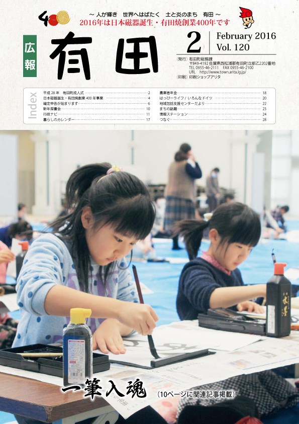 2016年広報ありた2月号 最終更新日:2024年1月17日 印刷 C O N T E N T S 2. 平成28年 有田町成人式 4. 日本磁器誕生・有田焼創業400年事業 6. 確定申告が始まります 10. 新年席書会 11. 行政ナビ 17. 暮らしのカレンダー 18. 農業者年金 20. はっぴーライフ / いろんなドイツ 22. 地域包括支援センターだより 23. まちの話題 24. 情報ステーション 28. つなぐ 電子ブックデータ HTML5版 Flash版 電子ブックデータのバックナンバーは こちらからダウンロードできます (※外部リンク) 広報ありた 過去データ 過去の掲載分は以下のURLで閲覧できます。 eBPark九州・山口 (http://kyushu.ebpark.jp/book/index/category/cate/111)