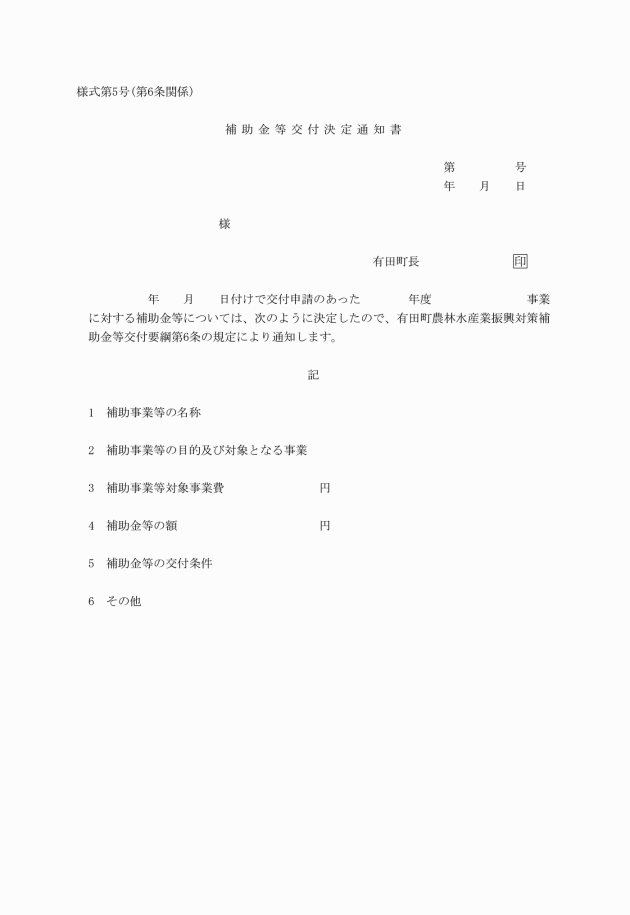 第6条 町長は、補助金等の交付を決定した場合は、決定の内容及びこれに条件を付したときはその条件を補助金等交付決定通知書(様式第5号)により申請者に通知するものとする。