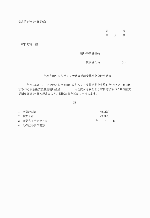 第1条 町長は、有田町まちづくり活動支援制度要綱(平成18年有田町告示第44号。以下「制度要綱」という。)第4条第2項の規定に基づき、制度要綱第4条第1項に規定するまちづくり組織(以下「補助事業者」という。)に対し、予算の範囲内において補助金を交付することとし、その補助金については、有田町補助金等交付規則(平成18年有田町規則第51号。以下「規則」という。)及びこの要綱に定めるところによる。