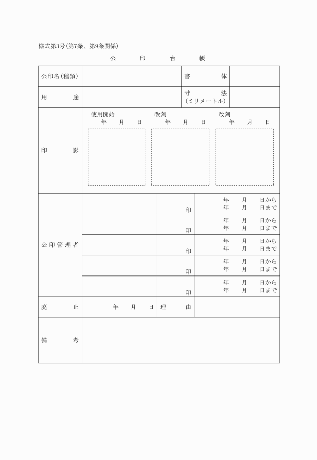 第7条 公印管理者は公印を新調し、改刻し、又は廃止しようとするときは、監査委員の決裁を受け、公印台帳(様式第3号)に登録しなければならない。