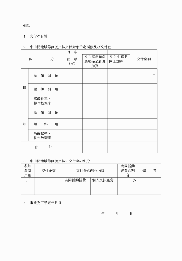 第3条 協定の代表者(以下「集落代表者」という。)は、中山間地域等直接支払交付金申請書(様式第1号)に、町長が必要と認める書類を添えて、町長が定める日までに町長に提出しなければならない。