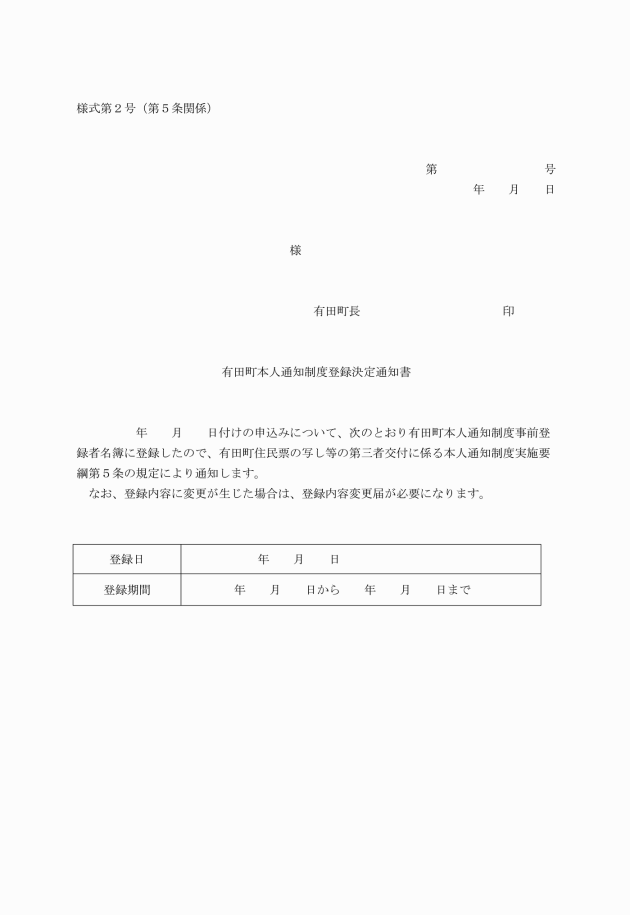第4条 本人通知制度の利用を希望する者(以下「申込者」という。)は、あらかじめ有田町本人通知制度事前登録申込書(様式第1号)により、町長に当該登録の申込みを行わなければならない。