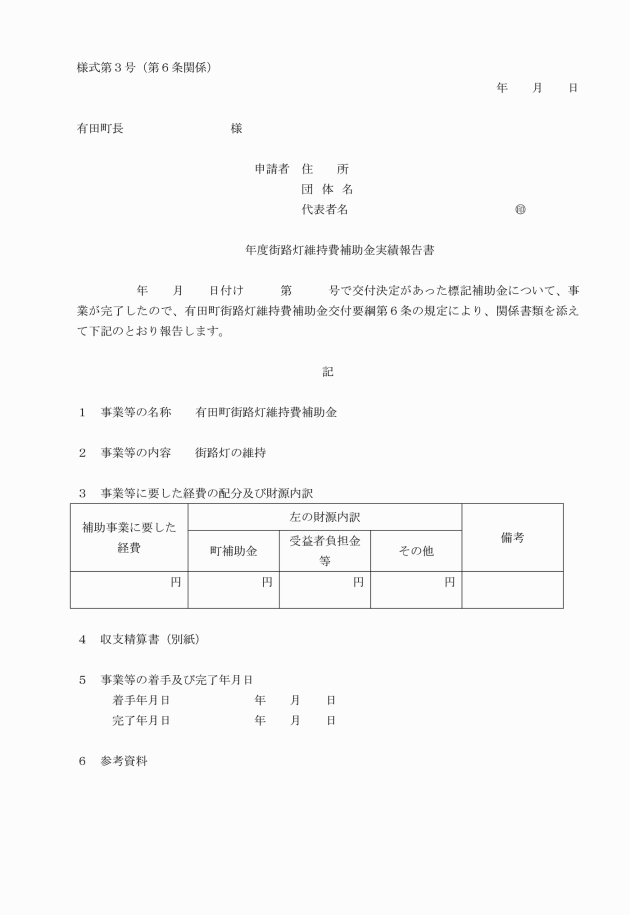 第6条 団体の長は、事業完了の日から30日以内に街路灯維持費補助金実績報告書(様式第3号)を町長に提出しなければならない。