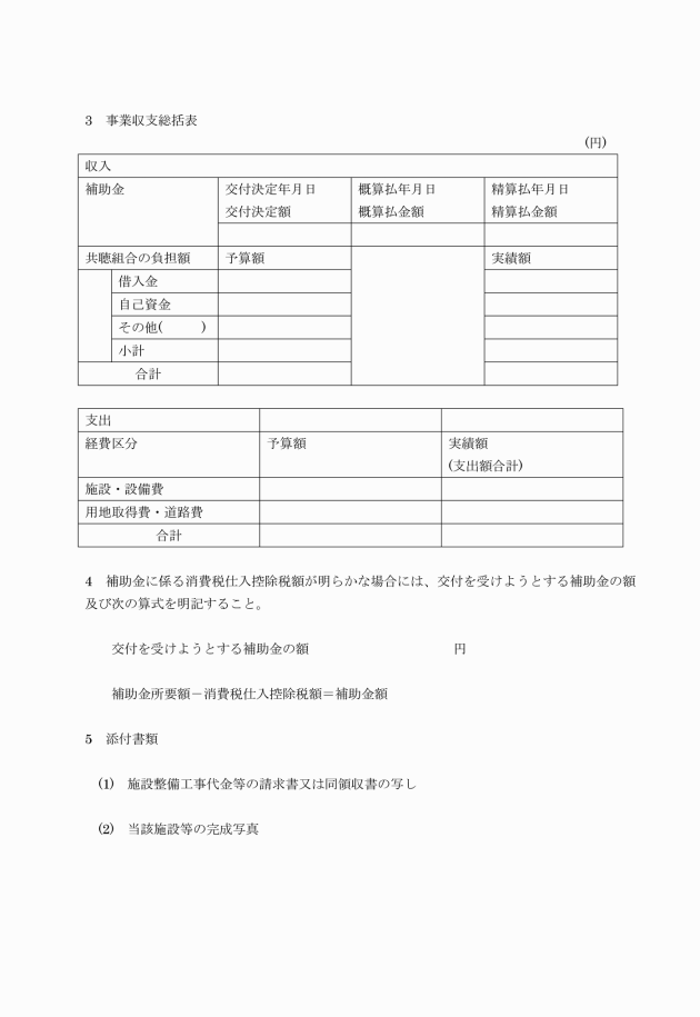 第5条 補助金の交付を受けようとする共聴組合は、地上デジタル放送受信対策事業費補助金交付申請書(様式第1号)に次の書類を添えて町長が別に定める日までに町長に提出しなければならない。