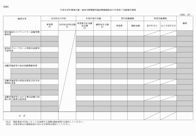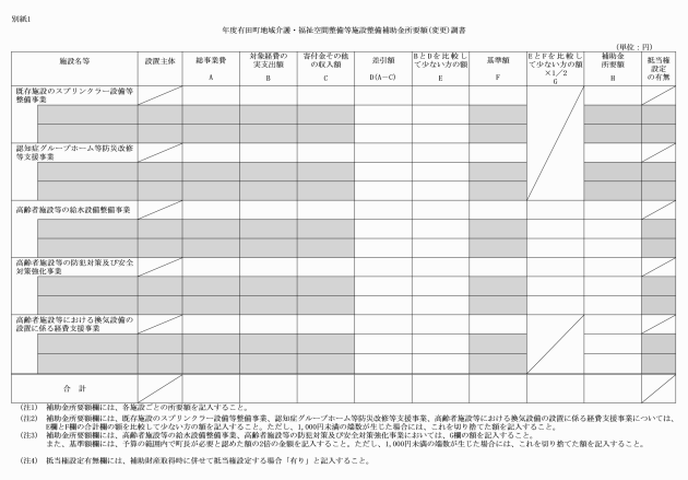 既存施設のスプリンクラー設備等整備事業 | 防災・減災等事業整備計画に基づく事業の施設の整備(施設の整備と一体的に整備されたものであって、町長が必要と認めた整備を含む。)に必要な工事費又は工事請負費及び工事事務費(工事施工のため直接必要な事務に要する費用であって、旅費、消耗品費、通信運搬費、印刷製本費及び設計監督料等をいい、その額は、工事費又は工事請負費の2.6%に相当する額を限度額とする。)ただし、別の負担(補助)金等において別途補助対象とする費用を除き、工事費又は工事請負費には、これと同等と認められる委託費、分担金及び適当と認められる購入費等を含む。 | |||||