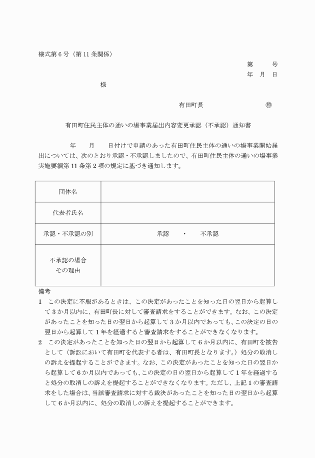 第10条 実施団体は、事業を廃止、休止又は再開しようとするときは、廃止、休止又は再開の日の30日前までに、有田町住民主体の通いの場事業廃止・休止・再開届出書(様式第3号)を町長に提出し、その承認を受けなければならない。