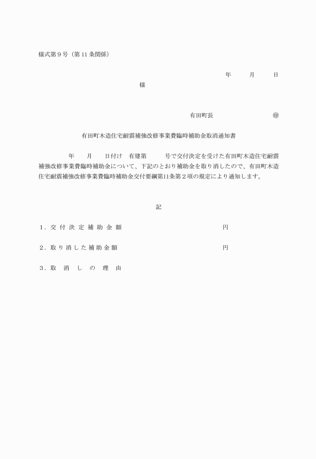 第5条 補助金の交付を受けようとする者(以下「補助事業者」という。)は、有田町木造住宅耐震補強改修事業費臨時補助金交付申請書(様式第1号)に、次に掲げる書類を添えて、町長に提出しなければならない。