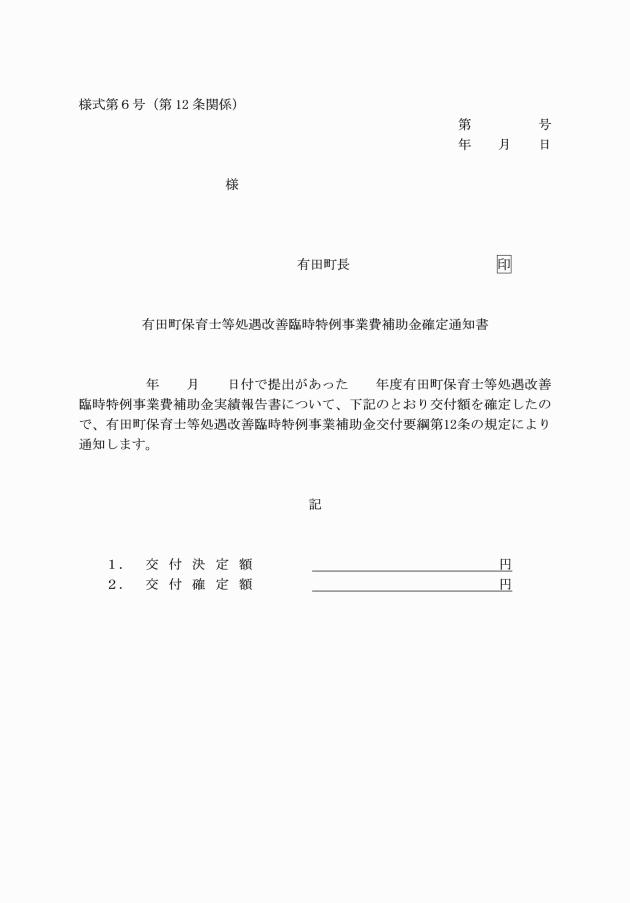 第13条 町長は、必要があると認めるときは、概算払で交付することができるものとする。この場合の補助金交付請求書は、有田町保育士等処遇改善臨時特例事業費補助金概算交付請求書(様式第7号)のとおりとする。