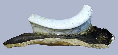 そういう方のために、とびっきりの証拠を一つご紹介します。もしかしたら、以前も掲載したかもしれませんが、小溝上窯跡で出土した図1の製品です。焼成の際にひずんでいるので分かりにくいですが、口の部分が染付磁器、胴部が鉄釉の壺の上部です。鉄釉製品には、磁器も陶器もありますが、内面を見ると、下部に青海波状の宛て目痕が残っており、叩き成形していることが分かります。叩き成形は陶器の技法で、磁器には用いられません。と、いうことは…。口縁部は磁器、胴部は陶器。これぞ陶磁器と言わずして何と呼ぶべきかという、まか不思議な種類の製品なのです。もし伝世品があっても、確実に贋物扱いでしょうね。磁器部と陶器部は焼成時に釉の熔融によって接着するようにしているので、当然、同時に焼かないとこんな変な製品はできません。また、一つの製品に陶器と磁器が使われているということは、陶器と磁器の生産は工人(業者)の違いもない、つまり、ずいぶん見た目は違えど、陶器と磁器に大きな技術差はないということが分かるのです。(村)H30.5.11