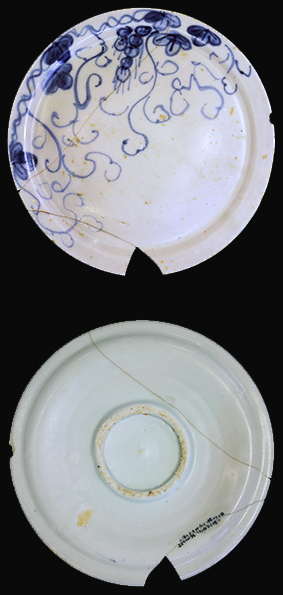 次に“柿右衛門様式”。器壁は薄く、表面は白磁の場合は乳白色、染付製品の場合も乳白色に近いですが、白磁と比べるといくらか青みがあります。皿の高台径は大きく、外面の文様配置などの基本は古九谷様式と共通します。施文は、構図に余白をたっぷり設け、非対称の構図とするのが基本です。
