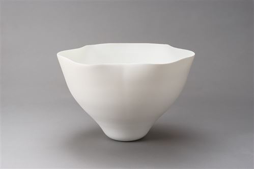 柔らかいフォルムの中にロクロの円心を感じさせる広がりを内包させた。特別な釉薬を開発し磁器の本来の肌触りを残しつつ絹のような、素朴な白を表現した。